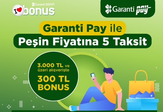 Garanti Pay ile Peşin Fiyatına 5 Taksit + 3.000 TL ve Üzeri Alışverişte 300 TL BONUS