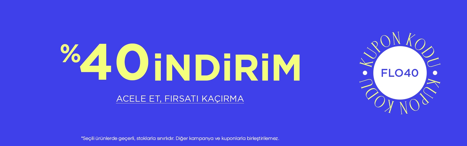 FLO’da NET %40 indirimli ürünler ACELE ET, FIRSATI KAÇIRMA FLO40 *Seçili ürünlerde geçerli, stoklarla sınırlıdır. Diğer kampanya ve kuponlarla birleştirilemez.