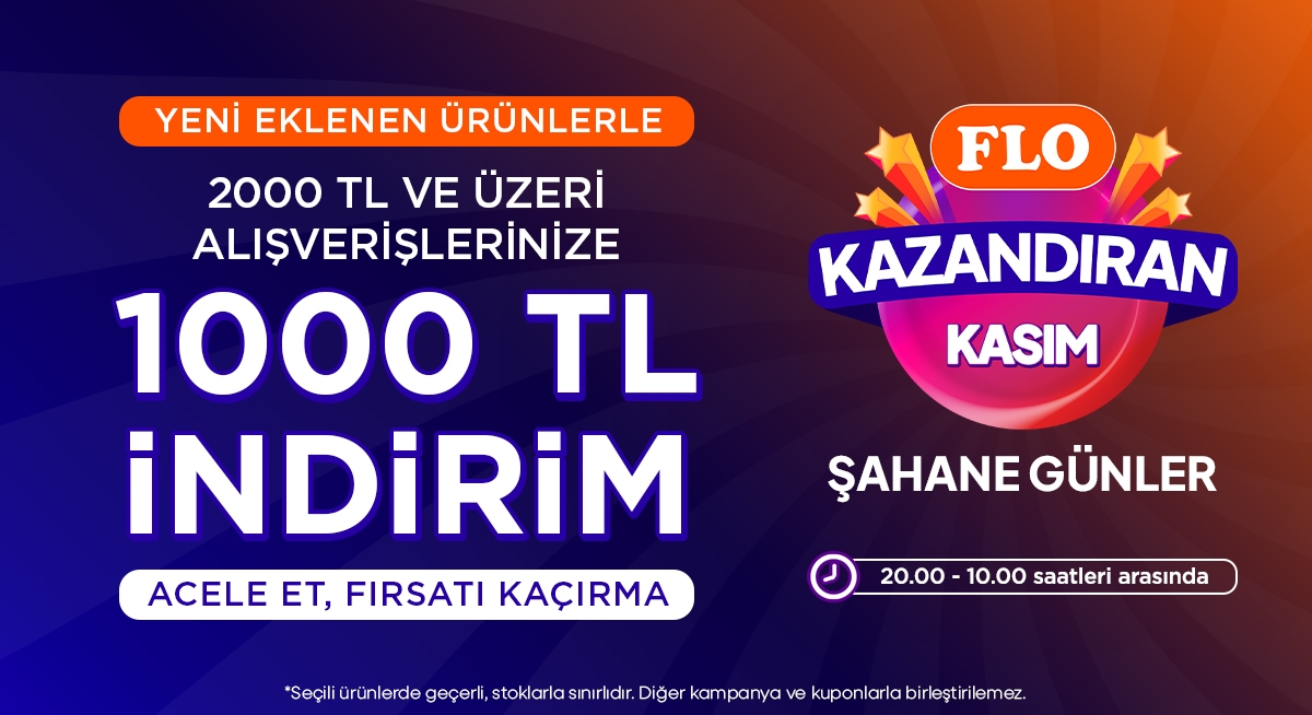 FLO 2000 TL’ye 1.000 TL İndirim: YENİ EKLENEN ÜRÜNLERLE 2000 TL VE ÜZERİ ALIŞVERİŞLERİNİZE 1000 TL İNDİRİM ACELE ET, FIRSATI KAÇIRMA *Seçili ürünlerde geçerli, stoklarla sınırlıdır. Diğer kampanya ve kuponlarla birleştirilemez. FLO KAZANDIRAN KASIM ŞAHANE GÜNLER 20.00 – 10.00 saatleri arasında